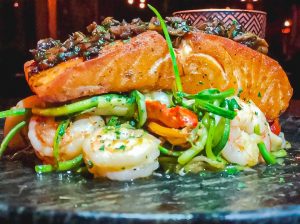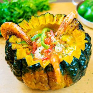 Entre os pratos mais pedidos da casa está o Camaron na Moranga – camarões servidos na abóbora inteira e cozida, com molho especial cremoso, mix de pimentões, cebola, tomate e cheiro verde. A iguaria, que, inclusive, é entregue dentro da moranga pelo delivery, acompanha arroz branco e purê de batata, ao preço de R$ 109,90 (para quatro pessoas).