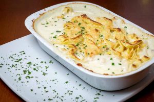 Preparado com ingredientes nobres, o Camaron Brasil leva camarões salteados na manteiga, enriquecidos com molho branco, arroz cremoso, ervilhas e presunto. Carro-chefe da casa, o prato é gratinado com queijo muçarela e acompanha batata palha artesanal, ao custo de R$ 109,90.