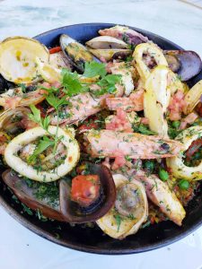 No Sagrado Mar as sugestões são o Sagrado Espeto (camarão, peixe, lagosta, polvo, lula e vegetais na brasa, acompanhado de batata e mandioca crocante com molho da casa), R$ 230,00 para duas pessoas; a Sagrada Paella (arroz espanhol, camarão, lula, polvo, lagosta, sardinha e mexilhão), serve duas pessoas ao valor de R$ 245,00; e o Polvo Rosti (polvo na brasa com chimichurri e batata rosti recheada de cogumelos), que serve duas pessoas ao valor de R$ 199,00.