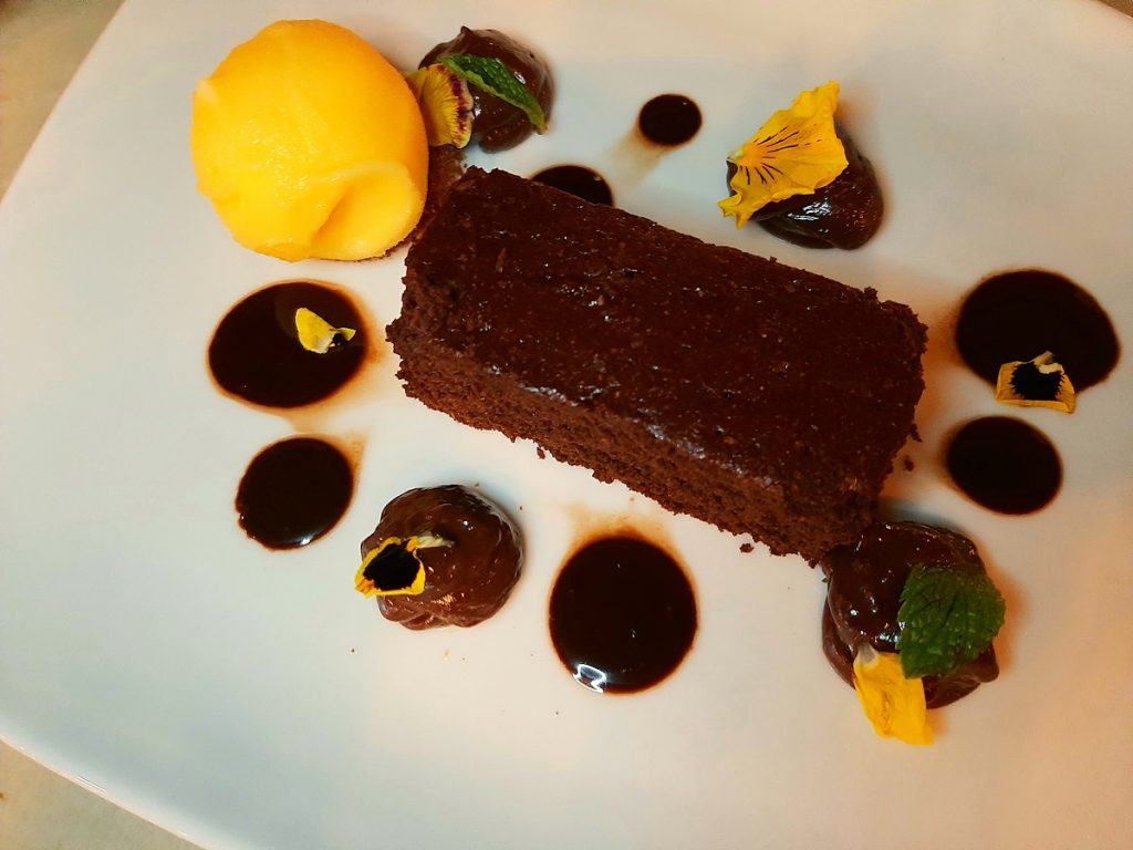 Conforme prometido por Marco Espinoza, as três sobremesas não contém glúten ou açúcar refinado. Mas nem por isso são desinteressantes. Muito antes pelo contrário. Chocólatra que sou, elegi como favorita a Cacau (torta de chocolate com creme de avelã, fudge de cacau e mascavo, mais gelato de tangerina (R$ 29). É aquela mistura de amanteigado com crítico e frescor que eu amo.