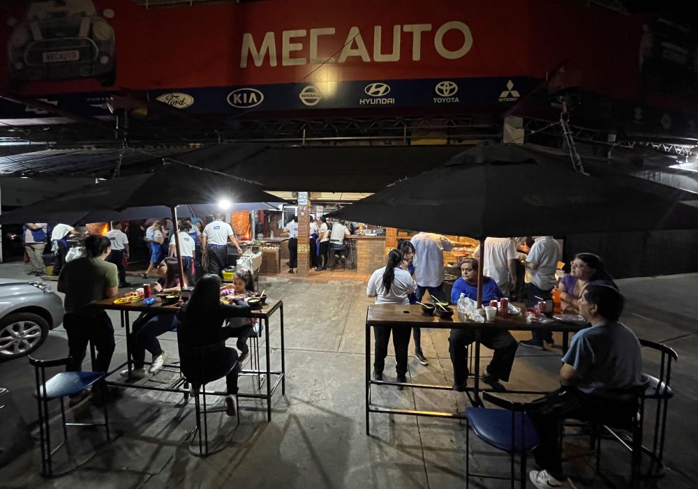 Ao lado, fixos, estão a cozinha e um bar com vista para a rua, onde os funcionários imediatamente começam a montar três enormes “trompos” de carne, adaptações do shawarma árabe, para serem assados.