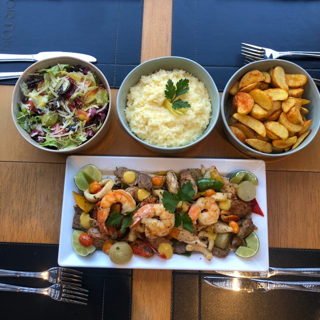 O Norton (Meliá Brasil 21, SHS) preparou duas receitas que serão servidas no sábado (12) e no domingo (13). O Parrila Terra e Mar é composto por bombom de alcatra, linguiça artesanal, peito de frango, camarão e lula. Como acompanhamento, salada da casa, arroz cremoso de limão e batatas rústicas. Serve três pessoas e custa R$ 240. Já o Escondidinho de Carne de Sol vem com o chamado Arroz Norton e salada da casa, também servindo três pessoas, por R$ 150.