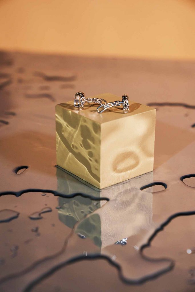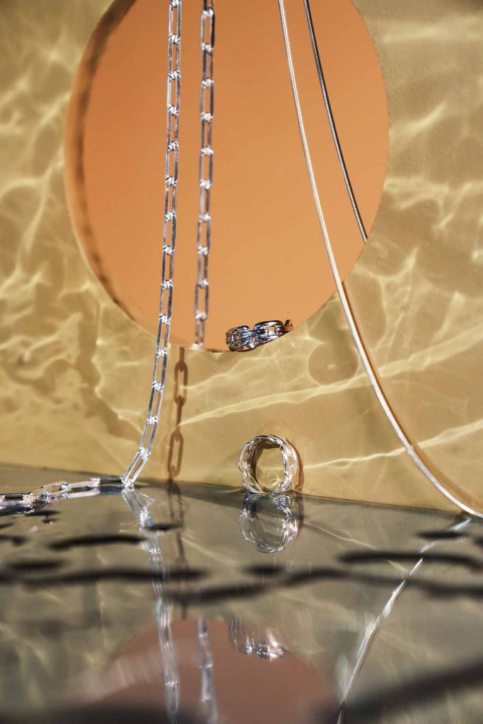 Sob o nome Naufrágio, o conjunto de joias apresenta peças em ouro e prata, que remetem ao fundo do mar. Pérolas, lagostas e correntes são os elementos trabalhados em anéis, pulseiras, colares e brincos de correntaria nos tons do amarelo.