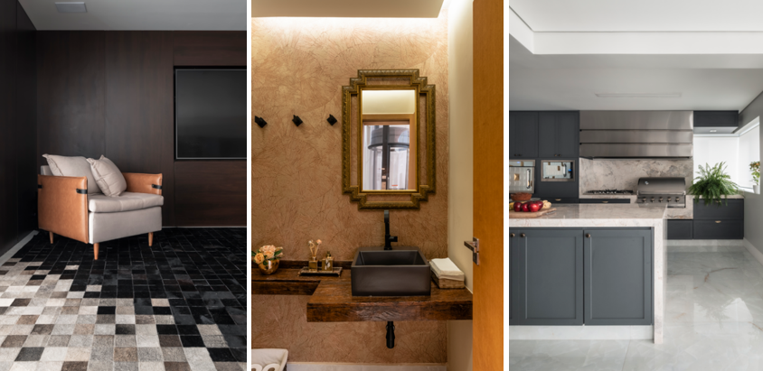 “Buscar os diferentes matizes ajudam a quebrar um pouco da regra de sempre misturar o preto com outras cores. Fica excelente uma fusão entre o intenso e o mais suave, assim como os tipos de acabamento como o fosco, brilhante, acetinado ou metálico”, recomenda Bernardo. Nessa alquimia, pode-se também considerar a madeira e o couro escuro, metal preto e estampas com listras e padrões geométricos.