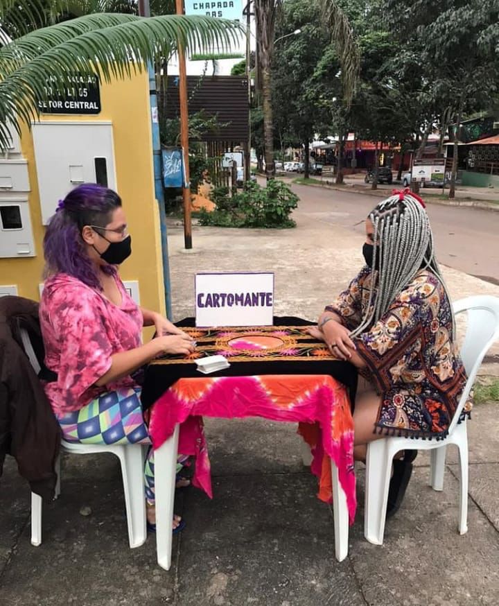 Aradia trabalha há mais de quatro anos exclusivamente com leitura de cartas, seja baralho cigano ou tarô. Ela conta que faz os atendimentos em diversos espaços, mas defende que jogar cartas em locais públicos e ao livre, como parques, orlas e praças é seu grande diferencial.