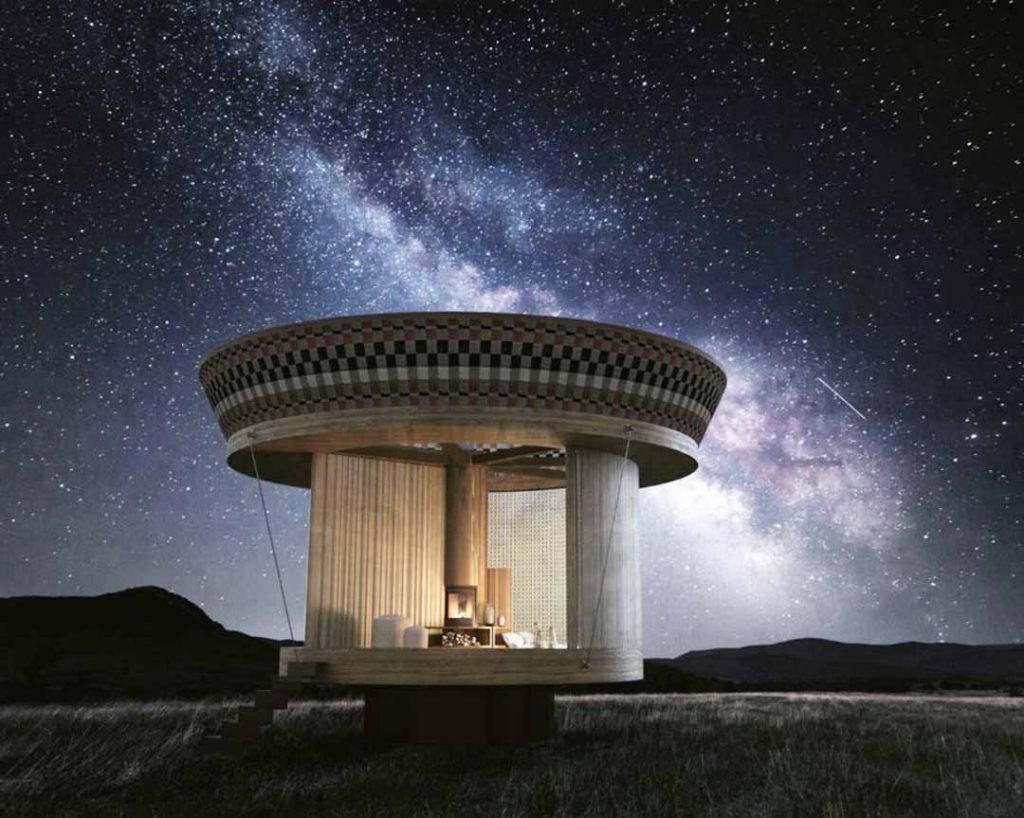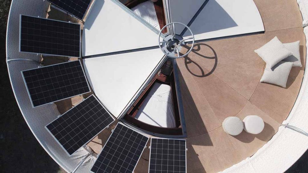 Outro ponto de alto da criação é a sustentabilidade. As madeiras que compõem a cabana são de origem sustentável, os tecidos são de plástico reciclado e a produção local está presente até na decoração, com cerâmicas feitas à mão. A estrutura também possui painéis solares e sistema de recuperação de água da chuva para reaproveitamento e tratamento de águas cinzas.