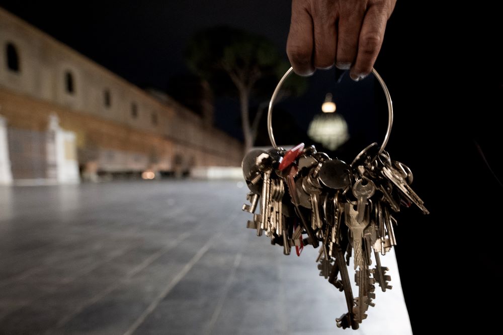 Durante a noite, Gianni Crea empurra a porta de entrada dos Museus do Vaticano, com um imponente chaveiro em mãos para abrir as galerias, que estão entre as mais visitadas no mundo.