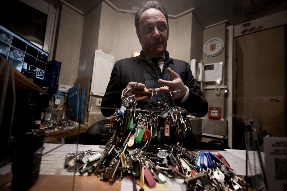 Em algumas horas, milhares de turistas lotarão as 1.400 salas. Antes do amanhecer, apenas o som metálico de seu chaveiro interrompe o silêncio dos aposentos à meia luz.