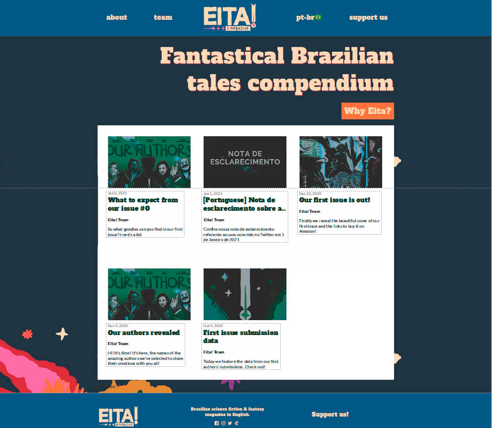 A equipe é formada pelo corpo fixo de sócios, que hoje conta com sete pessoas. Também há a colaboração de voluntários de diversas regiões do Brasil. “Nosso principal objetivo é ser a ponte para o lançamento de autores nacionais no mercado literário internacional, autores de todas as regiões do Brasil, incentivando o consumo de literatura brasileira pelo público do exterior e levando o máximo de representatividade que conseguirmos. Para isso, temos uma equipe fixa e diversa, dos quais muitos já trabalhavam no meio editorial”, completa Larissa. Os autores da Eita! recebem direitos autorais pelos contos publicados e são divulgados nas redes sociais da revista. Os interessados podem se inscrever e submeter seu texto para publicação através de editais no site da revista, o próximo edital está previsto para acontecer entre junho e julho deste ano.
