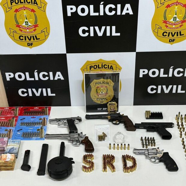Dentro do cofre, uma surpresa para os agentes: um arsenal ilegal composto por um revólver calibre .38, que havia sido relatado como produto de furto no Estado do Maranhão, um revólver calibre .357, uma pistola calibre .380, e uma pistola calibre 9mm com seletor de rajada. Também foram encontrados carregadores dos modelos “alongado” e “caracol”, além de munições de diversos calibres e aproximadamente R$ 6.000 em espécie.