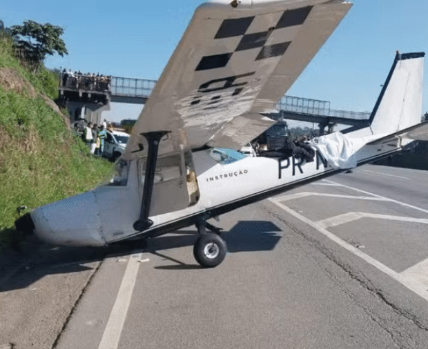 Avião colidiu com um caminhão na aterrissagem. A Arteris, concessionária que administra rodovia, afirma que o pouso resultou em um choque com o veículo que trafegava na rodovia.