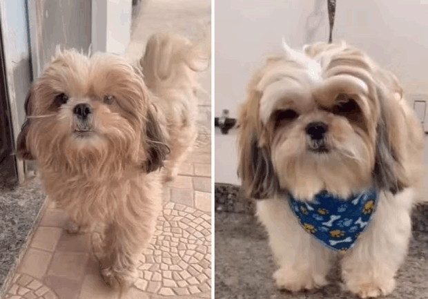 O banho, apelidado de “premium” pelos internautas, garantiu a transformação do peludo, que saiu do pet shop renovado e cheio de estilo.