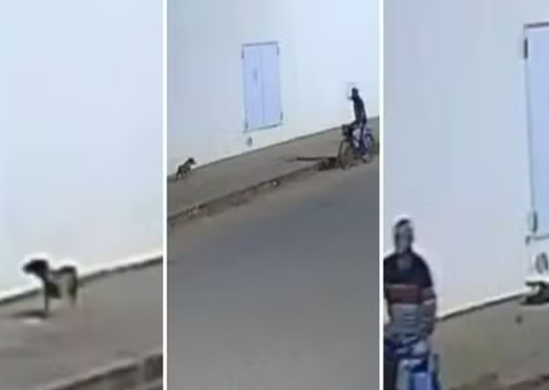 Câmeras de vigilância capturaram um ciclista lançando uma pedra em uma cadela em uma rua de Santa Bárbara de Goiás, região oeste do estado.