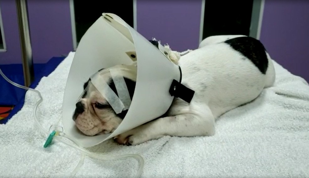 A filhote de buldogue Chiara, de quatro meses, sofreu um choque ao morder um carregador que estava conectado à tomada. O caso ocorreu em São Vicente, no litoral de São Paulo.