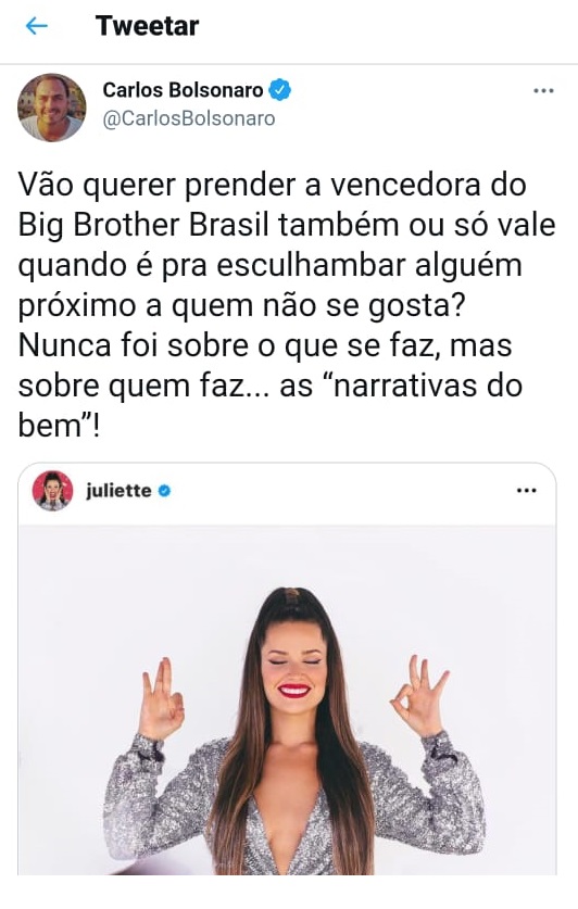 Na madrugada desta quarta-feira (5), o filho 02 de Jair Bolsonaro, o vereador Carlos Bolsonaro, disse que a vencedora do Big Brother Brasil, Juliette Freire, fez o mesmo gesto feito pelo assessor da presidência Filipe Martins. A postagem foi realizada no perfil do Twitter do político.