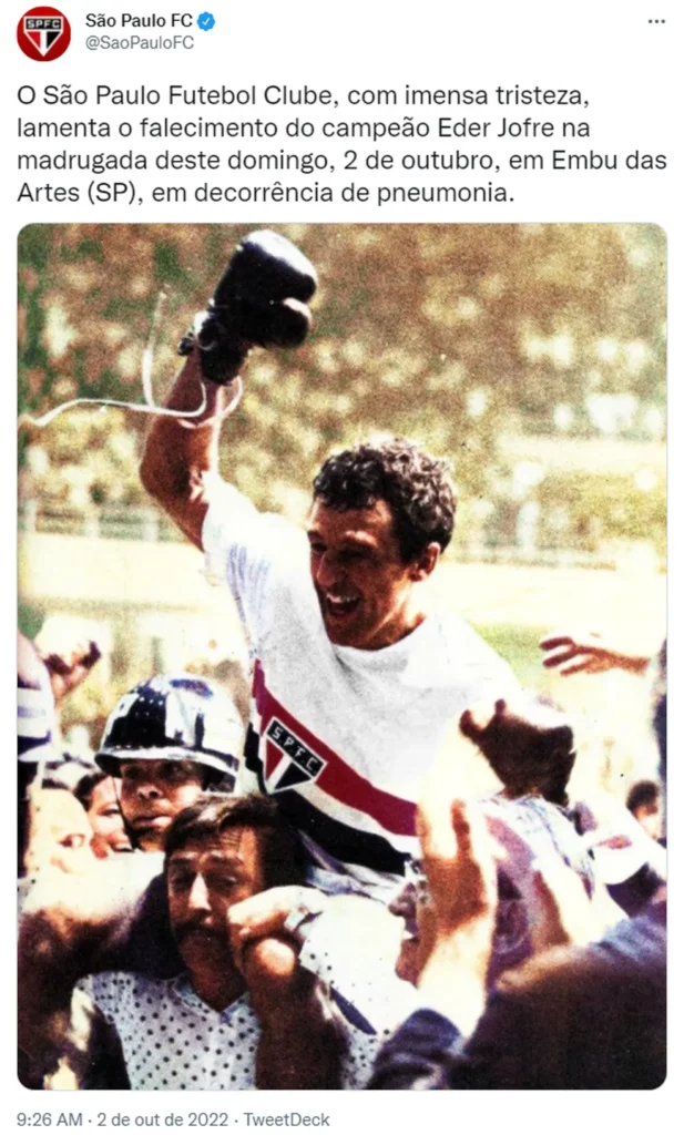 “O São Paulo Futebol Clube, com imensa tristeza, lamenta o falecimento do campeão Eder Jofre na madrugada deste domingo, 2 de outubro, em Embu das Artes (SP), em decorrência de pneumonia.