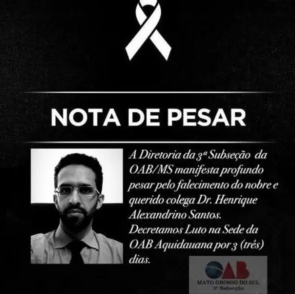 Henrique Alexandrino Santos, atuava como secretário-geral adjunto da Ordem dos Advogados do Brasil em Mato Grosso do Sul (OAB/MS) em Aquidauana. O Presidente Bitto Pereira também lamentou a morte do advogado.