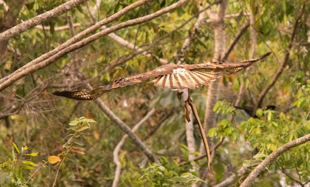 Um gavião foi flagrado carregando uma cobra em uma das garras após ter capturado o animal em Miranda, no Pantanal de Mato Grosso do Sul. A imagem foi registrada pelo biólogo Edu Fragoso e divulgada, no sábado (12), em uma rede social.