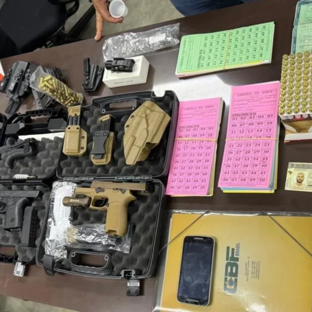 Com ele foram apreendidas três pistolas, 143 munições e 121 cartelas que seriam usadas em sorteios.
