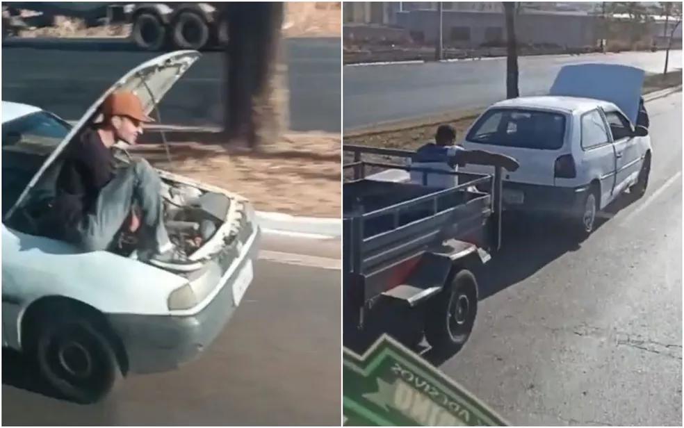 Dois homens foram filmados ‘tranquilamente’ enquanto faziam um trajeto muito arriscado em um carro, em uma avenida de Goiânia. Um deles estava sentado no motor e outro na carretinha que o veículo transportava.