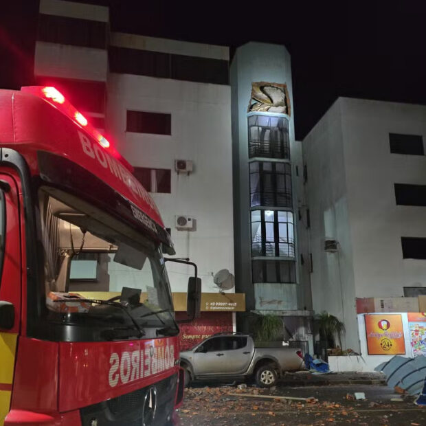 Na madrugada desta segunda-feira (7), a laje de um prédio residencial desabou em Xaxim, no Oeste catarinense, causando a queda de uma caixa d’água e derramando uma grande quantidade de água sobre a rua e um carro estacionado no local.