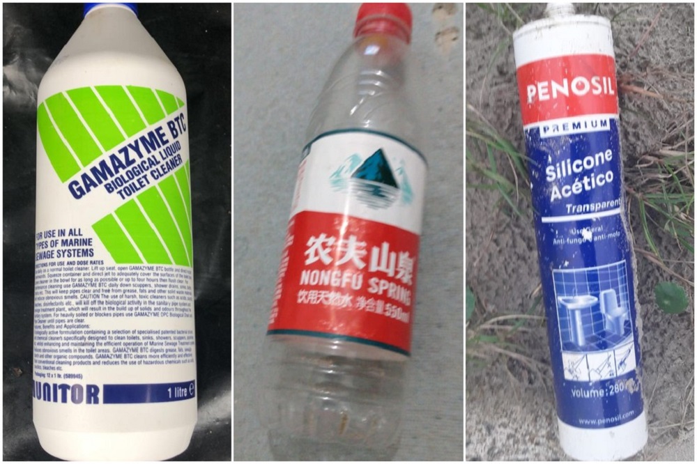 Na região do Peruíbe também foi encontrada uma caixinha de leite de soja da Malásia, além de embalagens de leite e um saco plástico para armazenamento de sulfito de sódio, ambos produzidos na Alemanha.