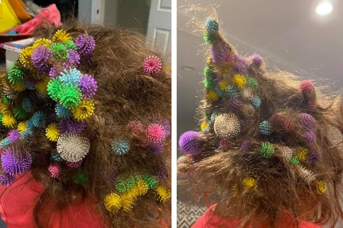 Lisa, mãe de uma casal de gêmeos, disse que uma das crianças foi até ela avisando que tinha algo preso no cabelo da irmã mais velha. A menina estava com os brinquedos presos no cabelo.