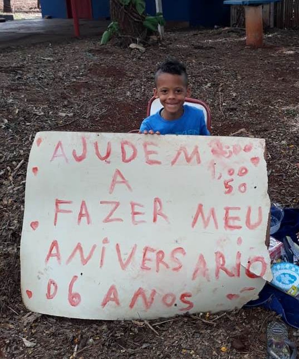 “Ajudem a fazer meu aniversário de 6 anos”, diz o cartaz do menino. O garoto pediu para que a mãe escrevesse o pedido e sugeriu o valor de R$ 0,50, R$ 1 ou R$ 2 para ajudar com a festinha.