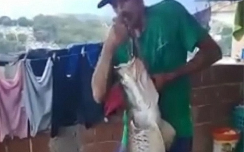Janiel é morador de Alto Amarelo, em Cachoeiro-ES, e para chegar em casa, carregou o pirarucu nas costas por cerca de 20 minutos. Essa espécie de peixe pode chegar a pesar 200kg.