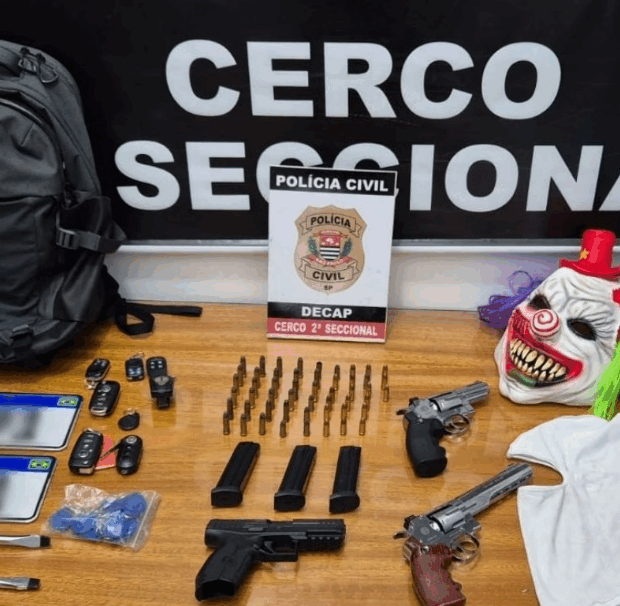 Foram apreendidos simulacros, armas, munições, ferramentas, controles de portão, 10 celulares e roupas. O carro usado pelos criminosos estava com placa adulterada e também foi recolhido.