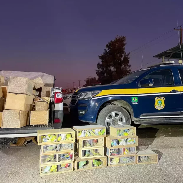 A Polícia Rodoviária Federal (PRF) encontrou e resgatou na tarde de segunda-feira, dia 1º, cerca de 115 pássaros exóticos que estavam sendo transportados ilegalmente em gaiolas, dentro de caixas de papelão, na caçamba de uma caminhonete. O caso aconteceu na BR 293, em Bagé, no Rio Grande do Sul. Os animais foram encaminhados para o órgão ambiental responsável e o homem que dirigia o veículo responderá pelo crime de maus tratos, informou a PRF.