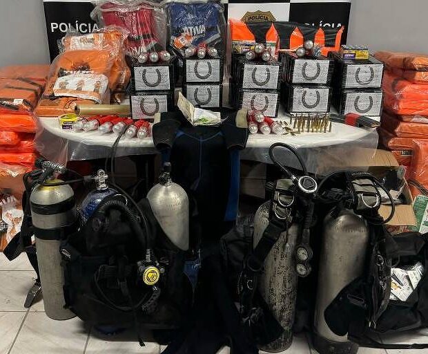 O suspeito foi detido no carro, em Guarujá. Já na casa, em Santos, foram encontrados, além dos carregadores de fuzil, cinco cilindros de oxigênio, munições, quatro roupas de mergulho, 13 eletrodos para solda, 33 coletes salva-vidas, 300 bexigas de borracha e 22 sinalizadores náuticos.