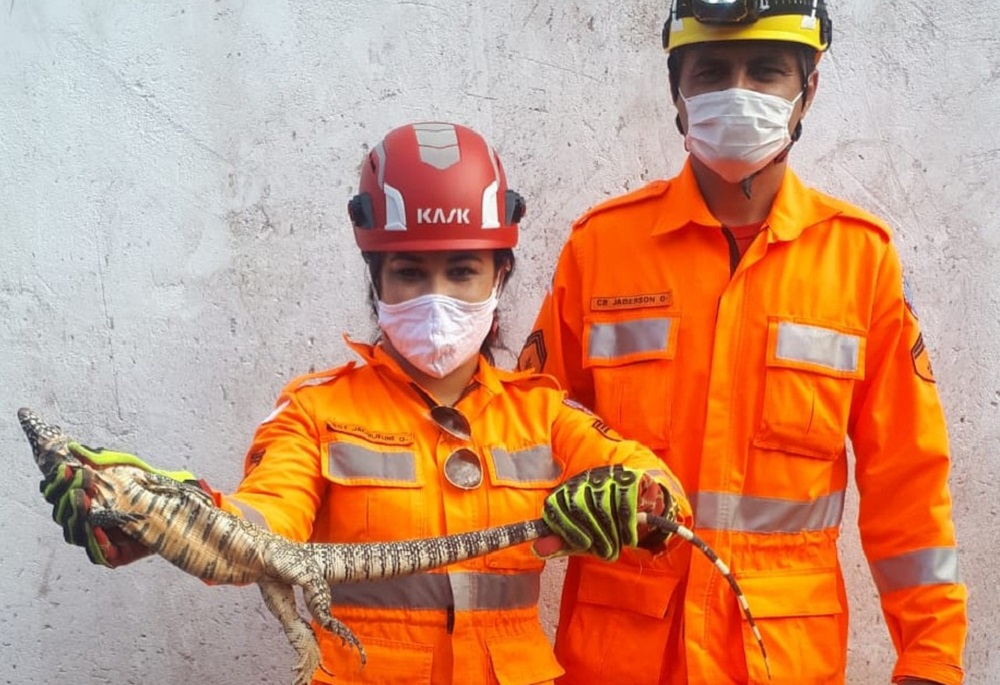 Após o teiú ser localizado, a equipe de bombeiros usou técnicas de salvamento para fazer a captura e o animal foi devolvido na própria mata da região.