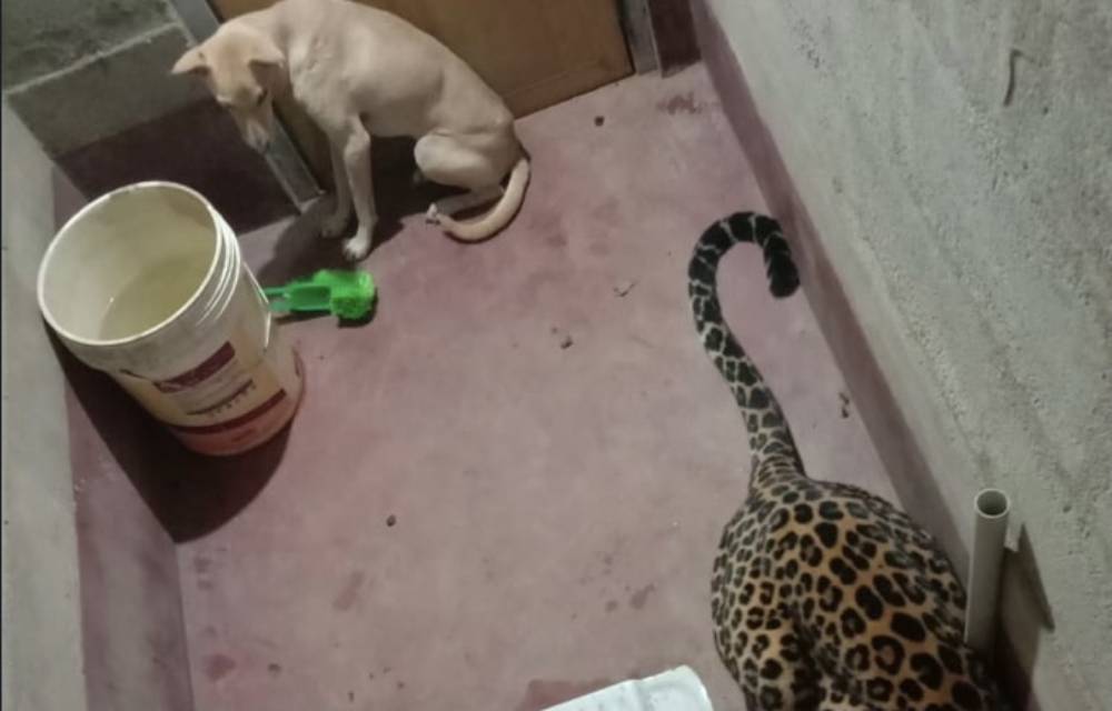 Imagens compartilhadas em rede social mostram o cachorro aparentemente assustado. O leopardo tenta fugir por uma fresta da janela. Veja: