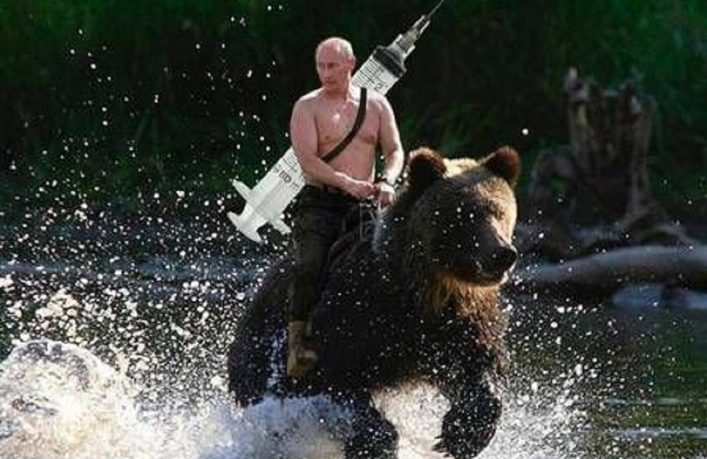 Entre as montagens que mais viralizaram nessa terça-feira (11) está a do presidente russo, Vladimir Putin, sem camisa, montado em um urso e com uma seringa gigante nas costas. Em outra postagem, os internautas sugerem que a vacina Russa seria composta por vodka.