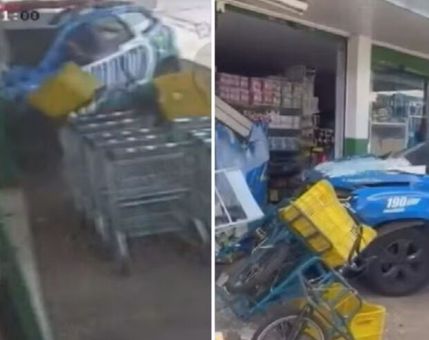 Imagens de câmeras de segurança mostram o momento em que a viatura quebra o vidro da fachada, derruba prateleiras e assusta uma funcionária que fazia a limpeza do local. Apesar do susto e dos danos materiais, não há registro de feridos.