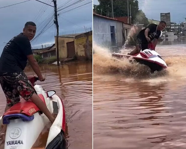 No vídeo, Gustavo Moreira conduz a moto aquática pela via como se estivesse em um rio ou lago, realizando manobras com facilidade. Na legenda e durante a gravação, ele ironiza a situação com uma crítica direta à gestão municipal: “O rolê, hoje, é na rua. Obrigado, meu prefeito!”, em referência ao prefeito Cristiomário (Progressistas).