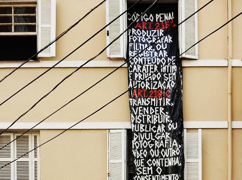Além disso, ela confeccionou um imenso cartaz vertical que foi exposto na sua janela. Na faixa, ela alerta os vizinhos os artigos do Código Penal que eles violaram, como o 216-B, que prevê pena de detenção de seis meses a um ano de multa a quem “produzir, fotografar, filmar ou registrar, por qualquer meio, conteúdo com cena de nudez ou ato sexual ou libidinoso de caráter íntimo e privado sem autorização dos participantes”.