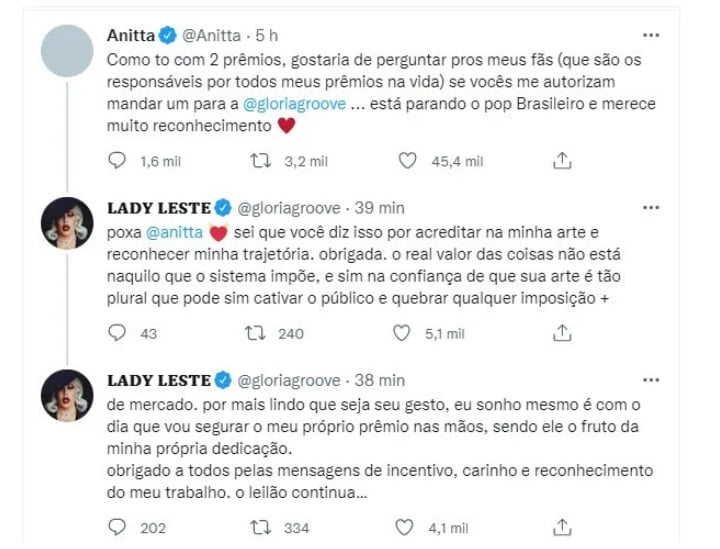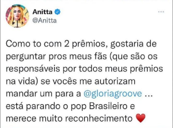 Em postagens no Twitter ela escreveu: “Como tô com dois prêmios, gostaria de perguntar pros meus fãs (que são responsáveis por todos meus prêmios da vida) se vocês me autorizam a mandar um pra Gloria Groove… está parando o pop brasileiro e merece muito reconhecimento.”