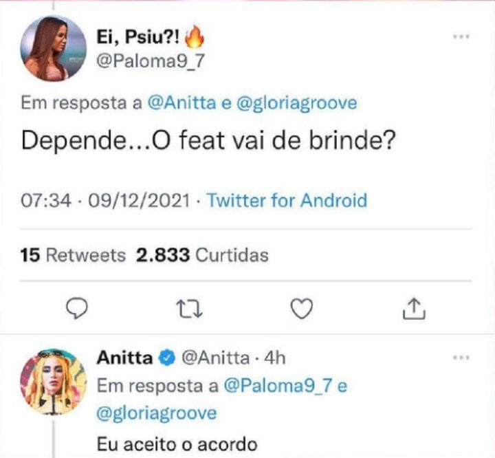 Logo, uma fã respondeu: “Depende… o feat vai de brinde?” e Anitta respondeu: “Eu aceito o acordo”.