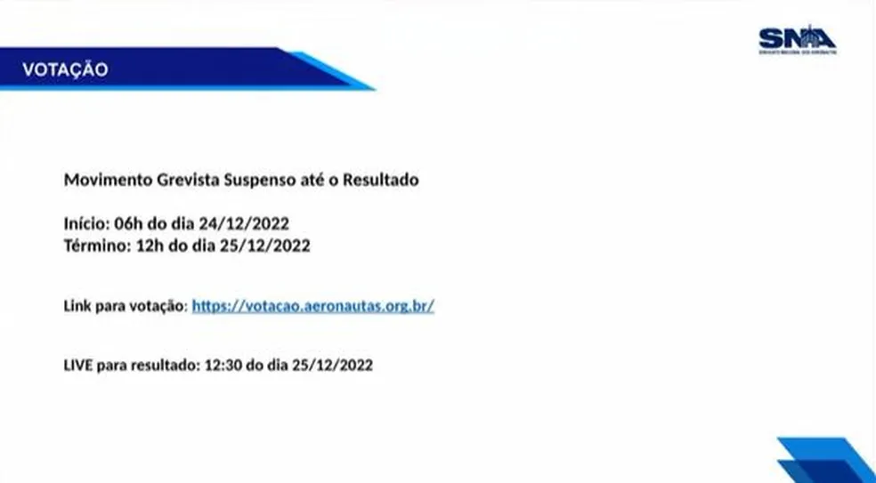 A greve dos aeronautas, que começou na última segunda-feira (19), está suspensa até o meio-dia de domingo (25). O Sindicato Nacioanl dos Aeronautas (SNA) publicou uma nota informando que o movimento aguardaria o resultado da votação de uma nova proposta apresentada pelas empresas.