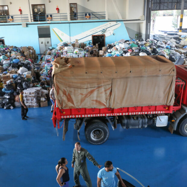 Na Base Aérea de Brasília, dois hangares foram tomados por doações. Há montes de caixas e sacos com roupas, e engradados de garrafas d’água são empilhados para caber no local.