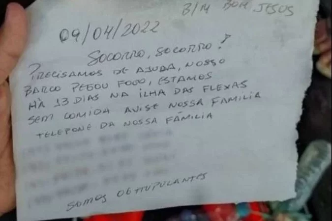“Socorro, socorro! Precisamos de ajuda, nosso barco pegou fogo, estamos há 13 dias na Ilha das Flexas (sic) sem comida. Avise nossas famílias”, diz o bilhete, escrito em letras garrafais, em que os desaparecidos também listaram o número de telefone dos familiares.