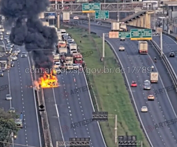 Um caminhão pegou fogo na madrugada desta quarta-feira (7/1) após um vazamento de óleo diesel no km 107 da Rodovia Anhanguera, na altura de Sumaré, no interior de São Paulo.