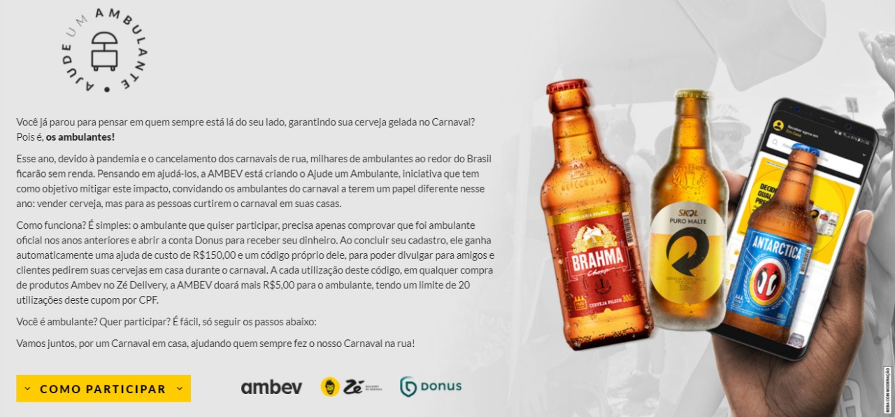 Sem poder contar com a renda dos dias de Carnaval, a companhia criou para eles, junto com o app Zé Delivery, a plataforma “Ajude um Ambulante”, um movimento para apoiar os vendedores com um auxílio financeiro, diminuindo o impacto das festas que não vão acontecer.