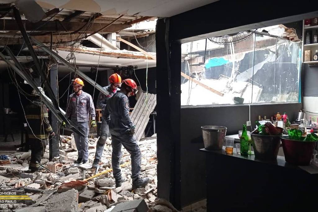 Imagens divulgadas pela corporação mostram parte do teto caído com muito entulho no chão, próximo ao bar da casa noturna.