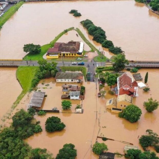 “Nunca tivemos um volume de água e uma enchente tão grande como essa. Choveu em 48 horas quase 630 mm, uma chuva histórica”, diz o prefeito Ary Vanazzi (PT). “O nosso dique foi projetado na enchente de 1941 e depois se repetiu na de 1965. Essa enchente agora foi 60 cm maior de que foi projetado em 1941.”