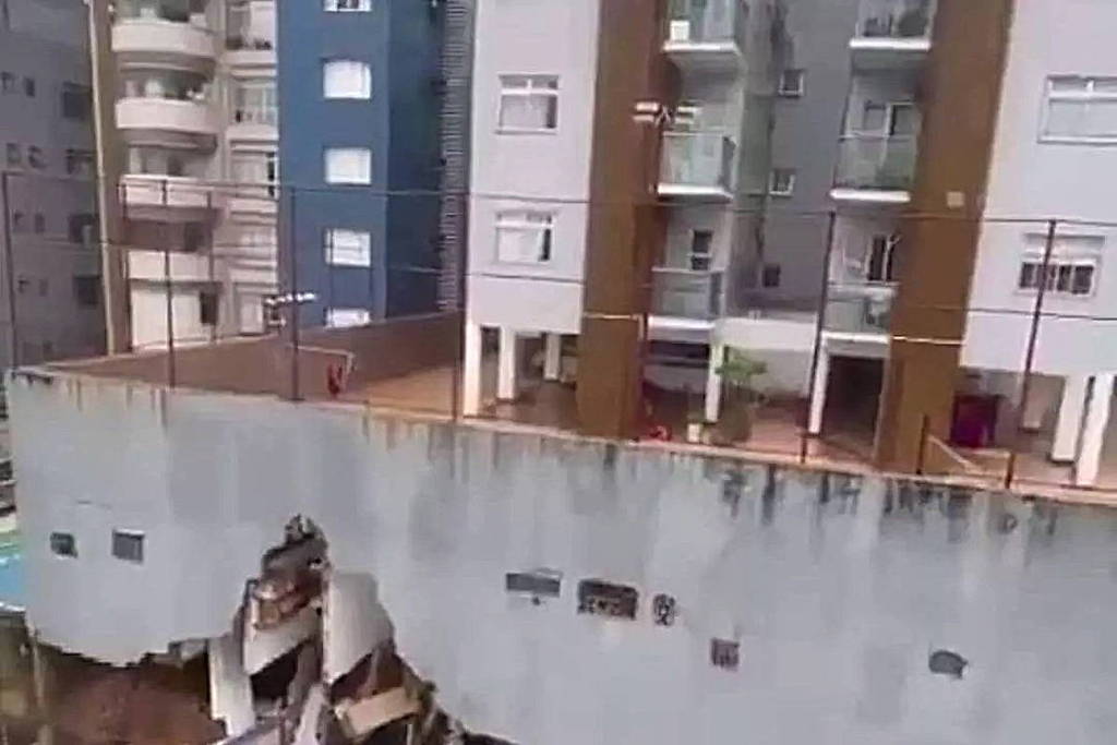 Após forte chuva em Belo Horizonte, a estrutura de um prédio no bairro Buritis, na região oeste da capital, começou a ceder, neste domingo (9). Em vídeos feitos por moradores, é possível ver parte do prédio que desabou.