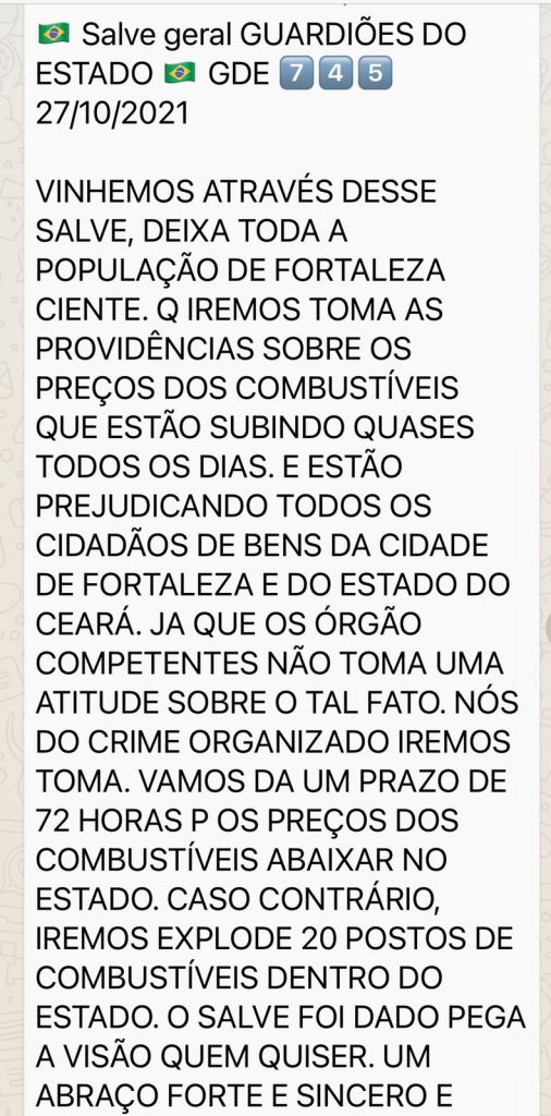 Com um prazo de 72 horas, o grupo criminoso, Facção Cearense determinou que os donos de postos em Fortaleza, no Ceará, baixem o preço da gasolina.