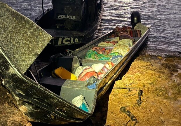A abordagem ocorreu durante fiscalização fluvial no Rio Negro. Segundo as autoridades, a lancha suspeita tentou escapar, mas acabou colidindo com pedras, ficando completamente danificada.